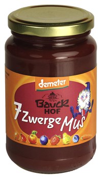 Das ist doch mal was anderes: ein Apfelmus mit Karotte, Birne und Hagebutte. Beim Namen 7 Zwerge Mus hat sich Anbieter Bauck Hof an den 7-Zwerge-Kindersaft von Voelkel angelehnt, was so auch auf der Packung steht. Der allerdings enthält hauptamtlich Traubensaft und ist dann geschmacklich doch etwas anderes.Das Mus von Bauck Hof ist ein Mix aus Apfel- und Möhrenmark, Birne und Heidelbeere sowie etwas