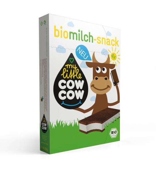 Nun kommen die Cow-Cow-Macher mit einem gekühlten biomilch-snack, der ab sofort in Bioläden erhältlich ist. Von den Zutaten her kommt er der Milchschnitte sehr nahe. Hauptzutaten sind Milch und Palmfett, dazu ist etwas Honig drin, zudem Glucosesirup und Kakao. Jedoch: die Biovariante enthält viel weniger Milch und Honig als die Milchschnitte – obwohl sie von beiden Firmen als wertgebende Zutaten beworben werden. Das Startup fordert sogar dazu auf: „Kau die Milch!“ Bei den geringen Milchmengen je Riegel (28 Gramm) bleib da allerdings wenig zum Kauen.