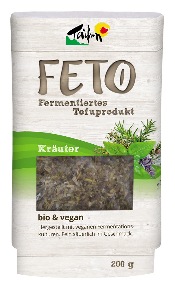Auf der BioNord-Messe sind wir kürzlich auf einen fermentierten Tofu gestoßen, den es seit kurzem zu kaufen gibt, den Feto Kräuter von Taifun. Die Kombination aus Fermentation plus Tofu ist noch relativ neu. In Bioläden und Veganläden gibt es zwar vereinzelt fermentierten Tofu. Aber bislang vor allem pur und damit leider eher fad. Jetzt gibt es ihn kräftig gewürzt.