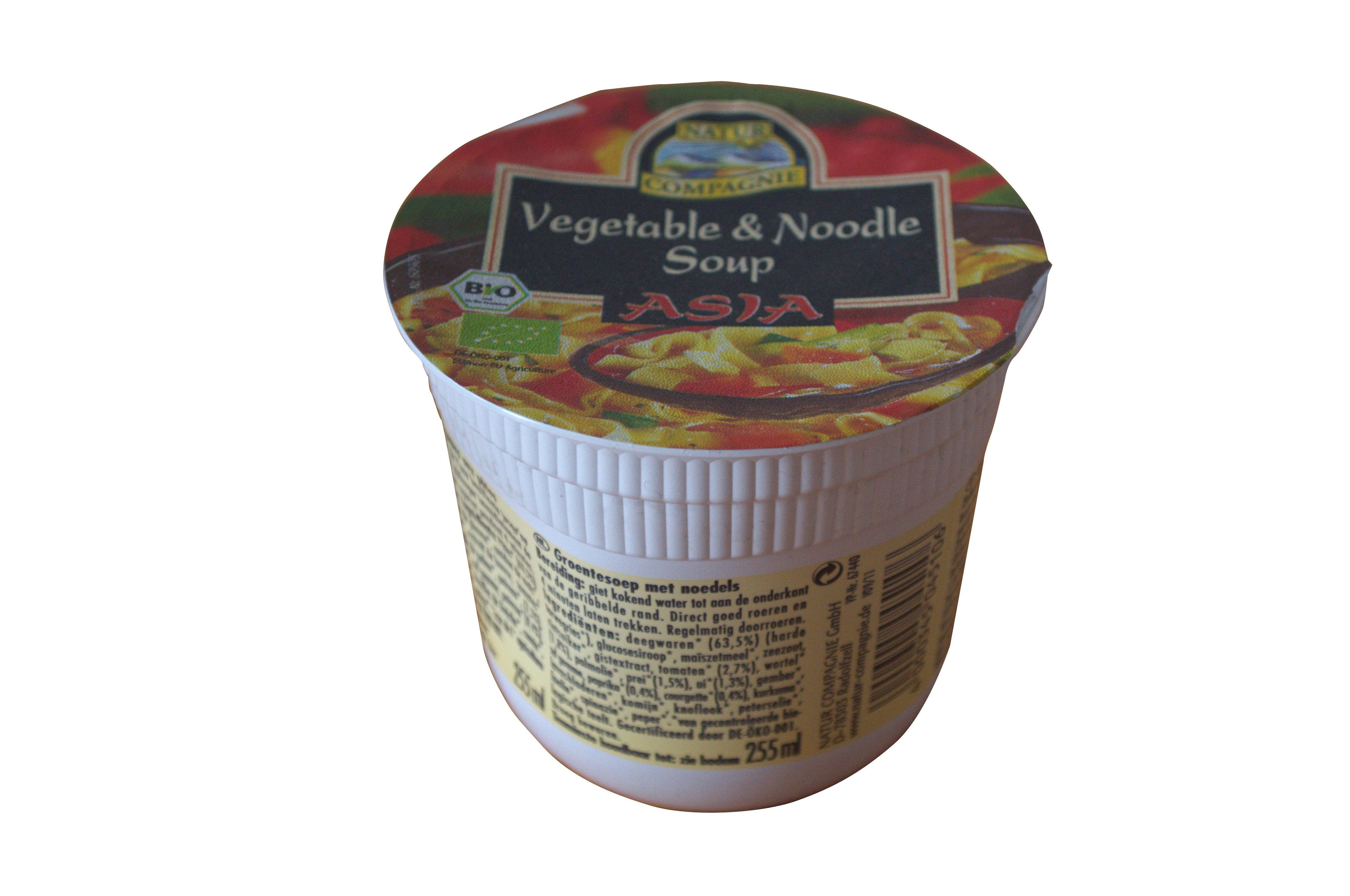 Auch in der Biowelt ist die heiße Suppe aus dem Becher angekommen. Wer Bio-Lebensmittel isst, will sich zwischendurch schließlich auch mal schnell einen warmen Snack genehmigen. Doch die Vegetable & Noodle Soup Asia mit Bio-Siegel von Natur Compagnie strotzt nicht gerade vor Gesundheit. Denn darin ist kaum Gemüse enthalten – 8 Prozent sind es – dafür aber viel zu viel Salz und: Hefeextrakt. Ja, ohne Geschmacks-verstärkende Zutaten scheint es nicht zu gehen. Denn sie bringen Geschmack, wo Gemüse durch die Zubereitung fad geworden ist, und Gewürze sparsam eingesetzt werden und sich somit nicht durchsetzen können. Dass diese Suppe mit Zucker angereichert wird, erwartet man so auch nicht. Eine Prise Zucker ans herzhafte Essen, dagegen ist nicht einzuwenden. Ein Teelöffel ist aber doch zu viel. Die Vegetable & Noodle Soup Asia erhält wegen dieser Mängel ROT in der Bio-Food-Tester-Ampel.